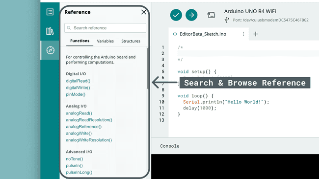 The reference is an embedded version of the Arduino Language Reference, which helps you understand the Arduino programming language & syntax.