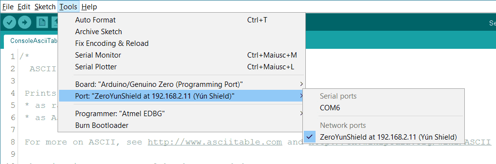 After configuring your Yún Shield, connect to the network you specified in the configuration settings. Open the Arduino Software (IDE). Under the Tools > Port menu, you should see an entry that lists your Yún Shield's name and its IP address.