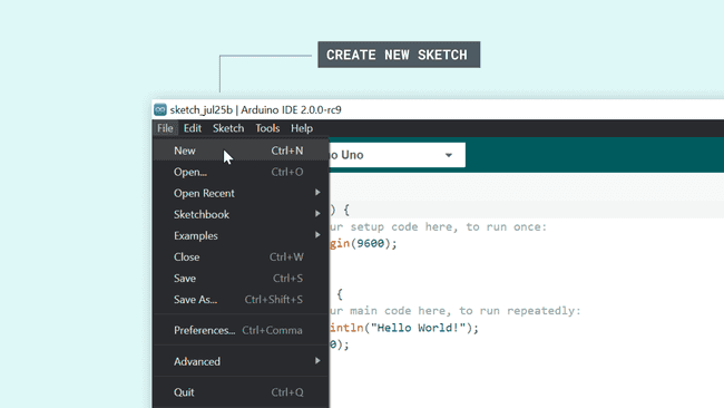 2. Now, we need to create a sketch that includes some configurations needed, so that our board can communicate with our computer. Mainly, we need to set a baud rate, which is done by writing