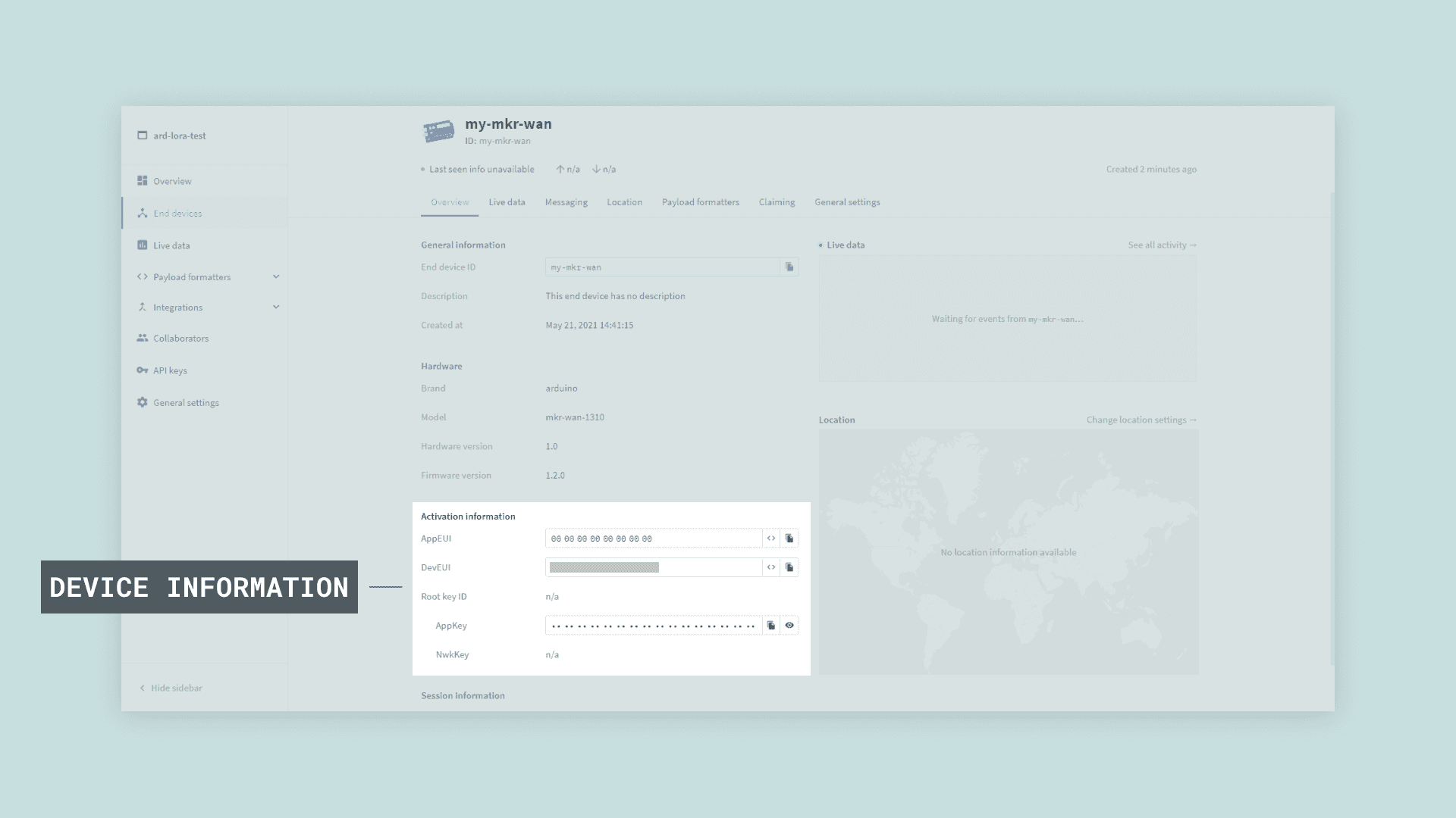 In our device overview, we can now see three rows: Device EUI, Application EUI and App Key. These contain information that we will need in the next few steps.