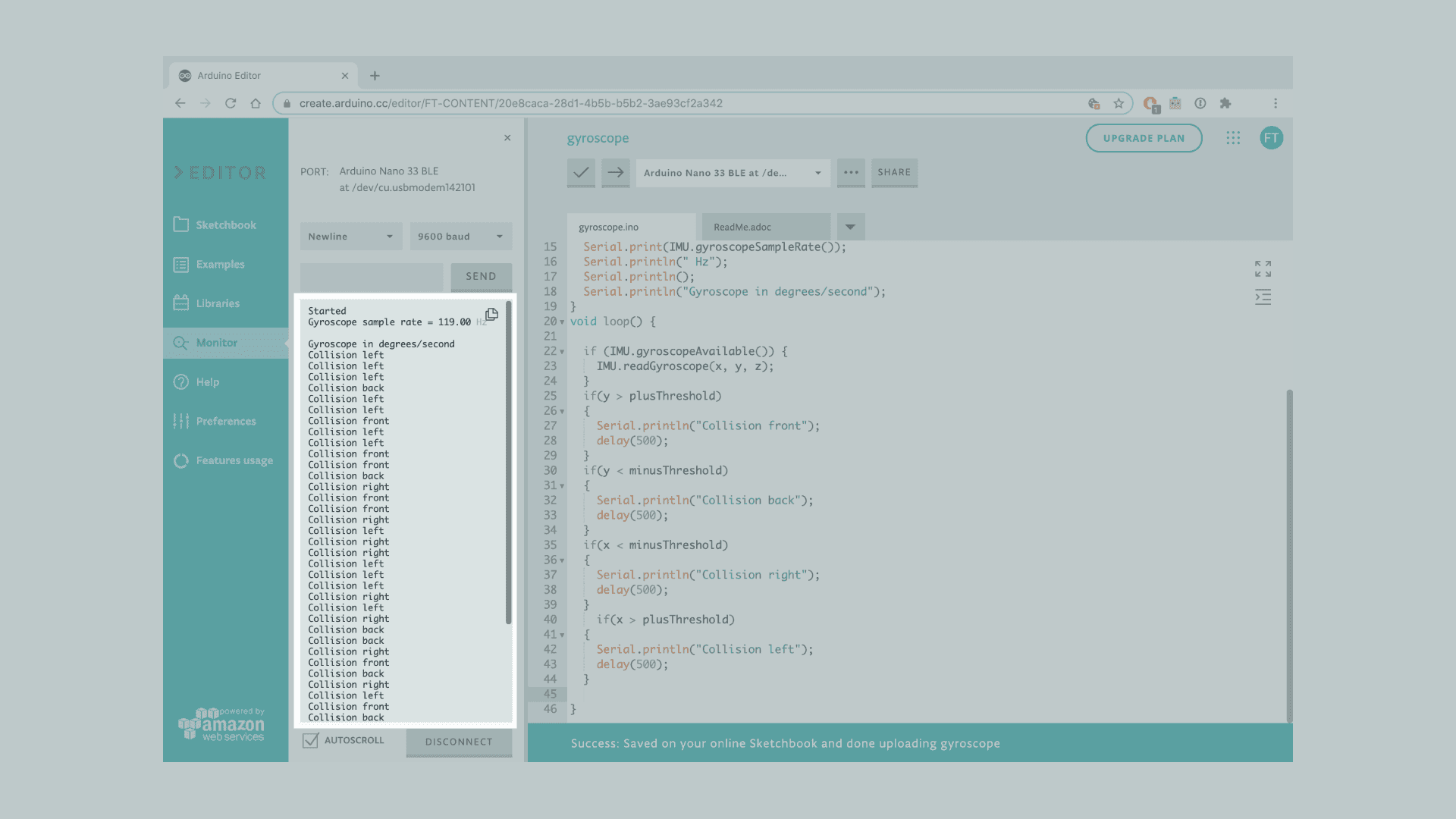 29 if (!IMU.begin()) {30 Serial.println("Failed to initialize IMU!");31 while (1);32 }33 Serial.print("Gyroscope sample rate = ");34 Serial.print(IMU.gyroscopeSampleRate());35 Serial.println(" Hz");36 Serial.println();37 Serial.println("Gyroscope in degrees/second");38}39void loop() {40 41 if (IMU.gyroscopeAvailable()) {42 IMU.readGyroscope(x, y, z);43 }44 if(y > plusThreshold)45 {46 Serial.println("Collision front");47 delay(500);48 }49 if(y < minusThreshold)50 {51 Serial.println("Collision back");52 delay(500);53 }54 if(x < minusThreshold)55 {56 Serial.println("Collision right");57 delay(500);58 }59 if(x > plusThreshold)60 {61 Serial.println("Collision left");62 delay(500);63 }64 65}Testing It Out