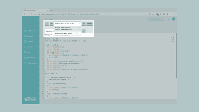 Let's start by opening the Arduino Web Editor, click on the Libraries tab and search for the LSM9DS1 library. Then in > Examples, open the SimpleGyroscope sketch and once it opens, rename it as Gyroscope.