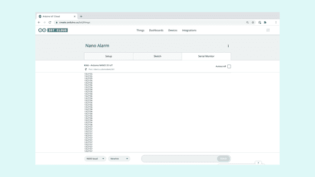 Let's start by opening the Arduino Cloud. Once we are in the Arduino Cloud, we will see the Things where we need to click the Create Thing button and rename it as Nano Alarm.