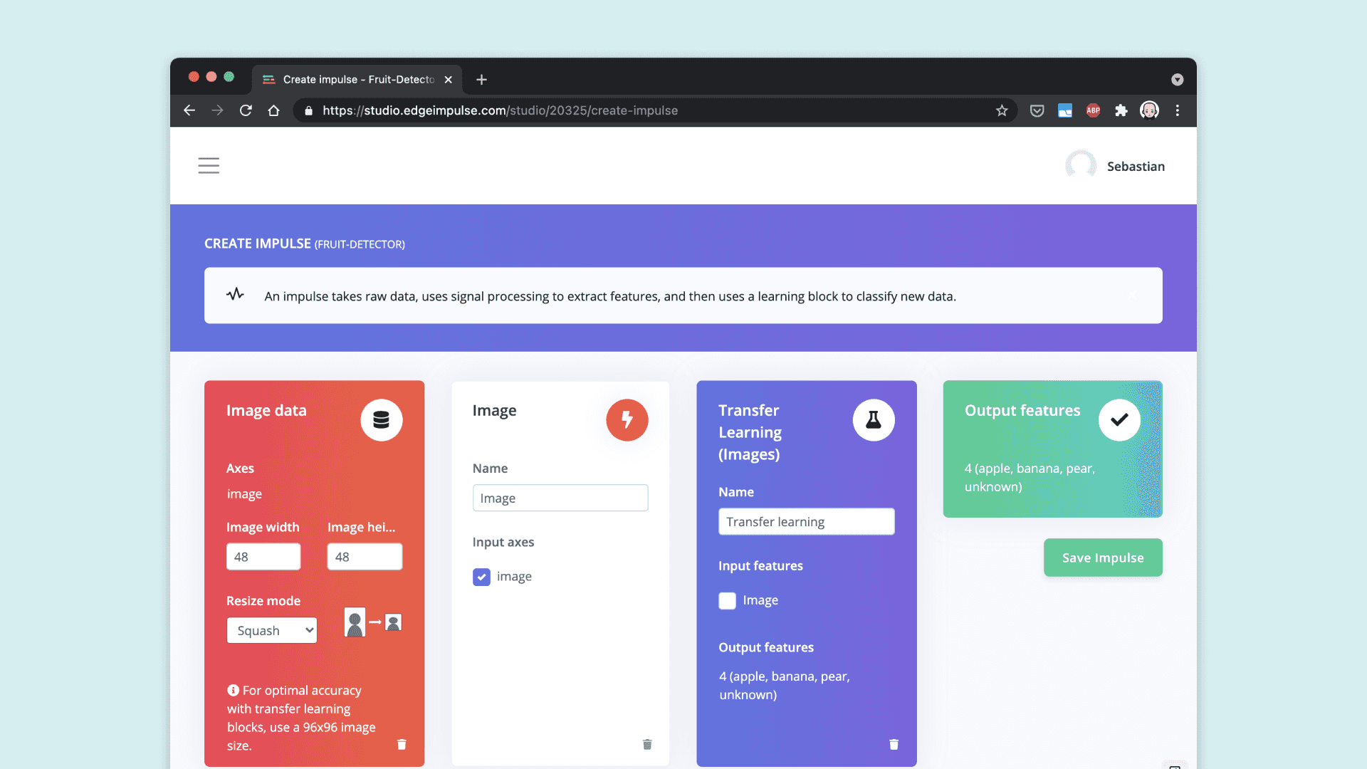 It is recommended to adjust the image size to 48x48 for improved performance. You can try with higher resolutions, but you will notice that the frame rate during the classification will drop significantly. Click on Save Impulse to apply the adjusted settings.
